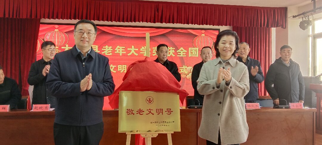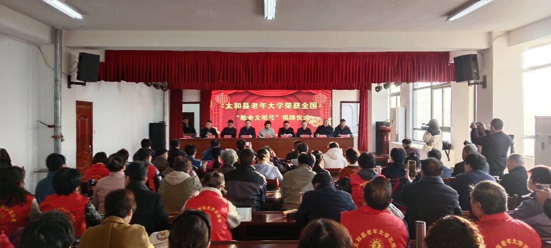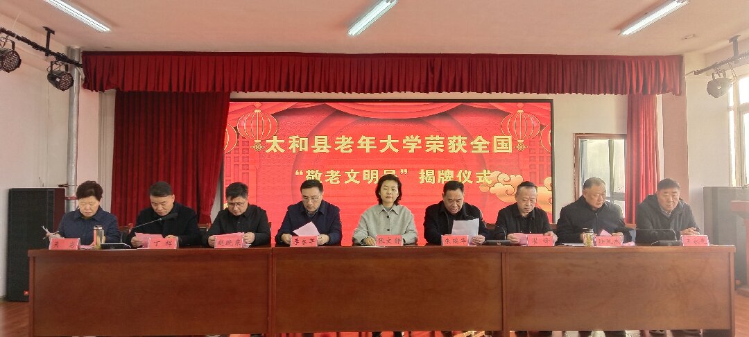 太和县老年大学荣获全国“敬老文明号”揭牌仪式11月26日举行,太和县委副书记张文静、副县长李永军出席并揭牌,县直相关部门负责同志、老年大学领导班子等共同见证这一荣耀时刻。