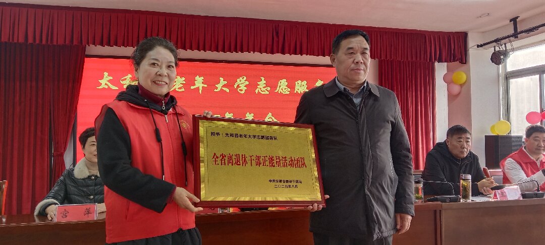 会上,朱瑞华为太和县老年大学志愿服务队授予“安徽省离退休干部正能量活动团队”牌匾。
