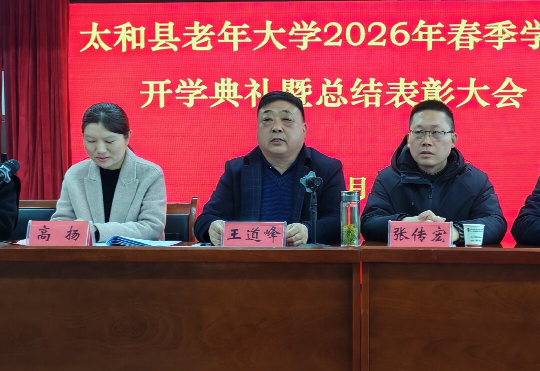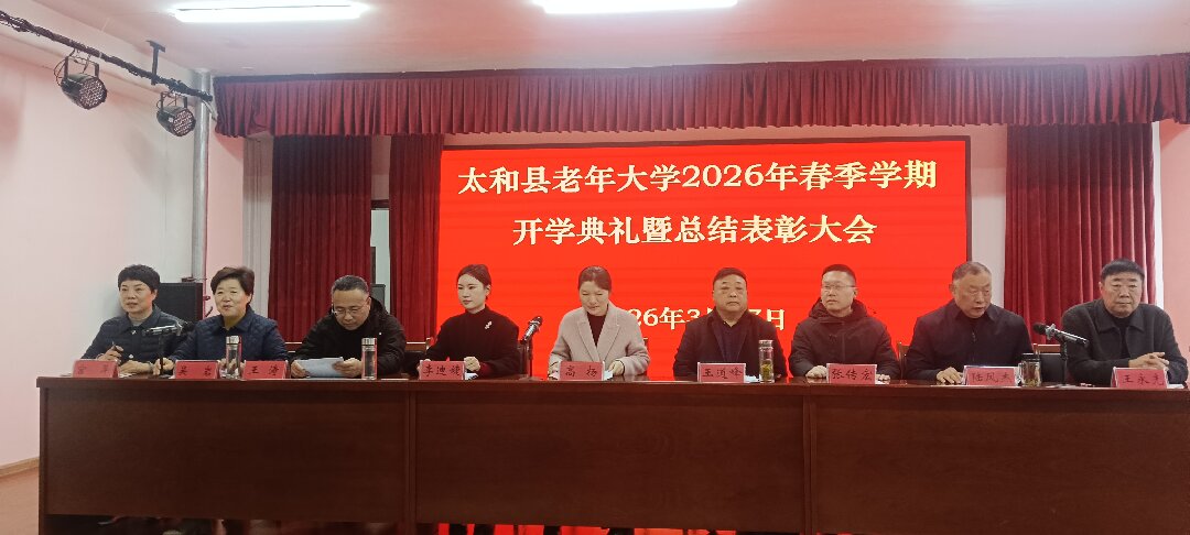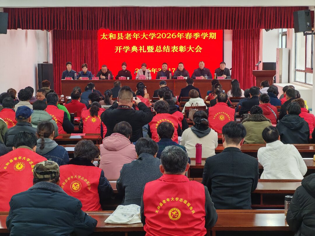 3月17日,太和县老年大学2026年春季学期开学典礼暨总结表彰大会隆重召开。县政府副县长高扬、县委组织部部务会成员王道峰,县委宣传部副部长李迪婕、县委社会工作部副部长张传宏及县直相关单位负责人、校领导班子、全体教师及学员、志愿者代表参加会议。