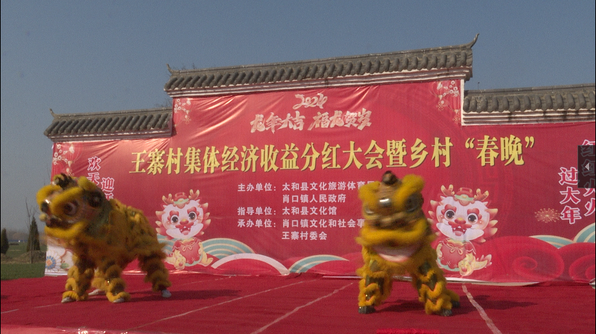 王寨村集体经济收益分红大会暨乡村“春晚”在双狮子舞中拉开序幕。文艺节目表演与80岁以上老人分红、人居环境整治先进个人、好人好事群众代表表彰同步进行。