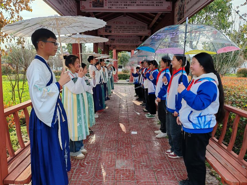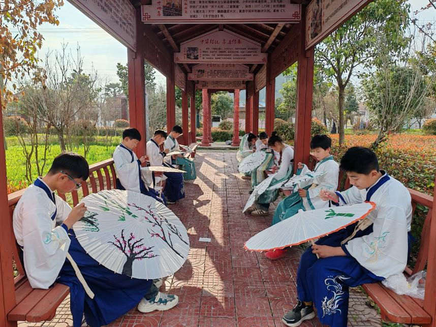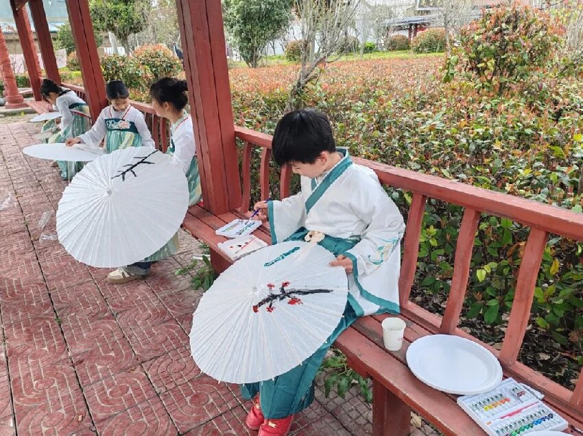 活动中,部分儿童身着汉服,手持油纸伞进行绘画,和身着校服绘制塑料伞的少先队员们进行一场古今的碰撞。